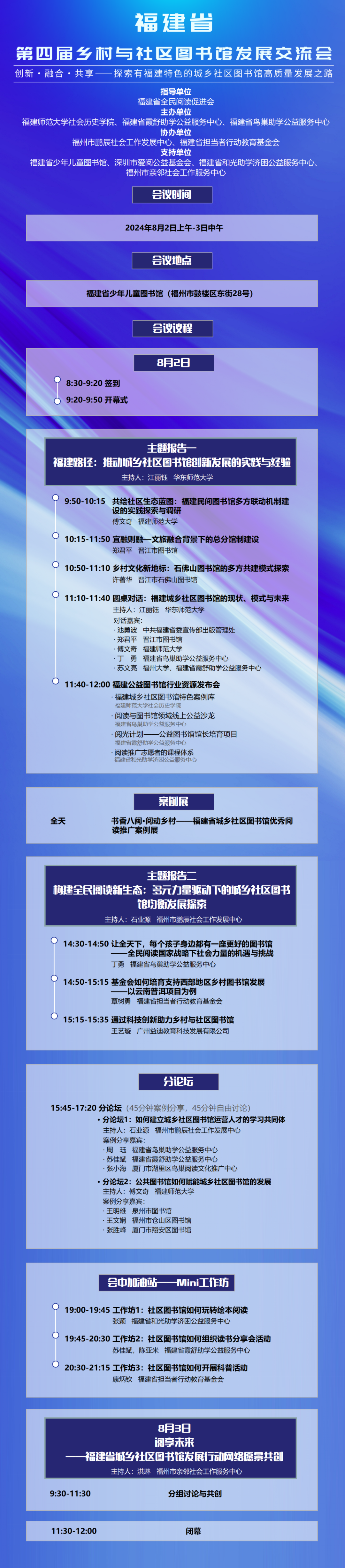 为此,2024年8月2日-3日,福建省第四届乡村与社区图书馆发展交流会将在福建省少年儿童图书馆举行。