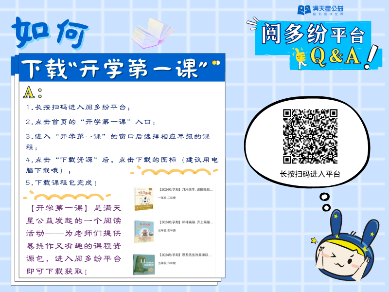 用开学第一课,和孩子一起读新学期的第一本书,给孩子满满的开学仪式感,开启元气满满的新学期吧!扫码进入【阅多纷】教师资源平台,即可畅享优质阅读资源包。