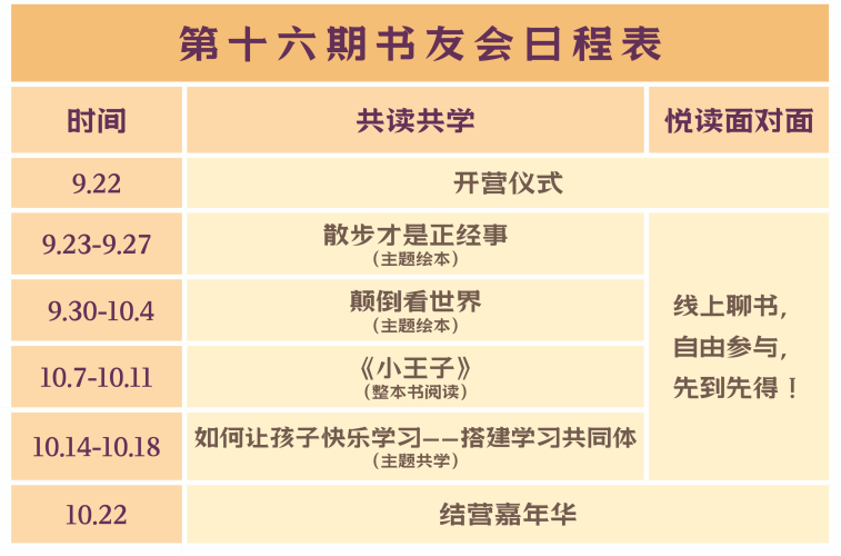为了让书友们有机会进行更加深度的阅读体验和分享交流,书友会期间将开展至少2场不同主题的线上“小班制”聊书会。(自由报名,名额有限,先到先得!敬请留意活动群中发布的相关报名信息。)