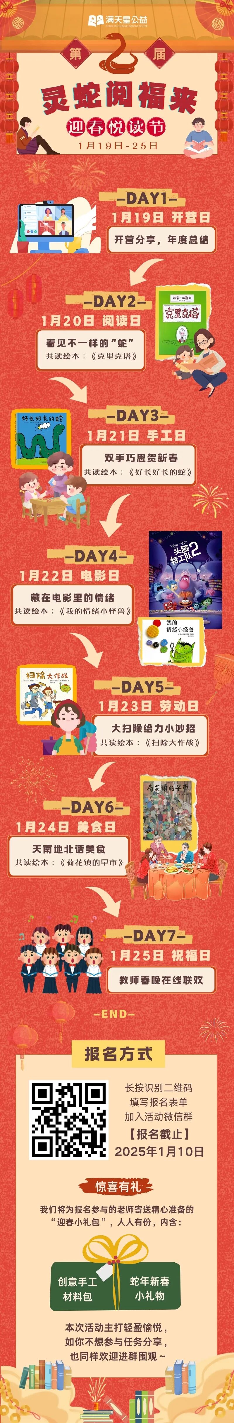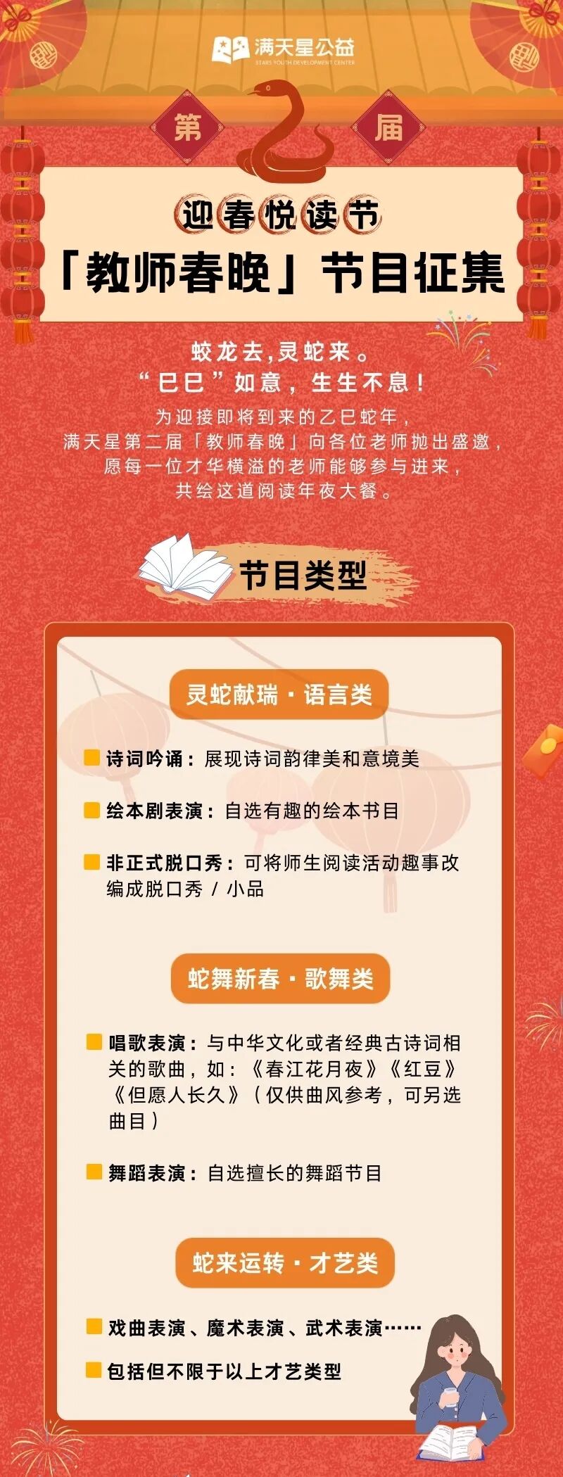 在这里,你可以尽情挥洒创意,展示真我风采,与同仁们共同绘制春晚的璀璨华章。让我们携手,将教育的热情与艺术的魅力完美融合,为“迎春悦读节”画上一个完美的句号。