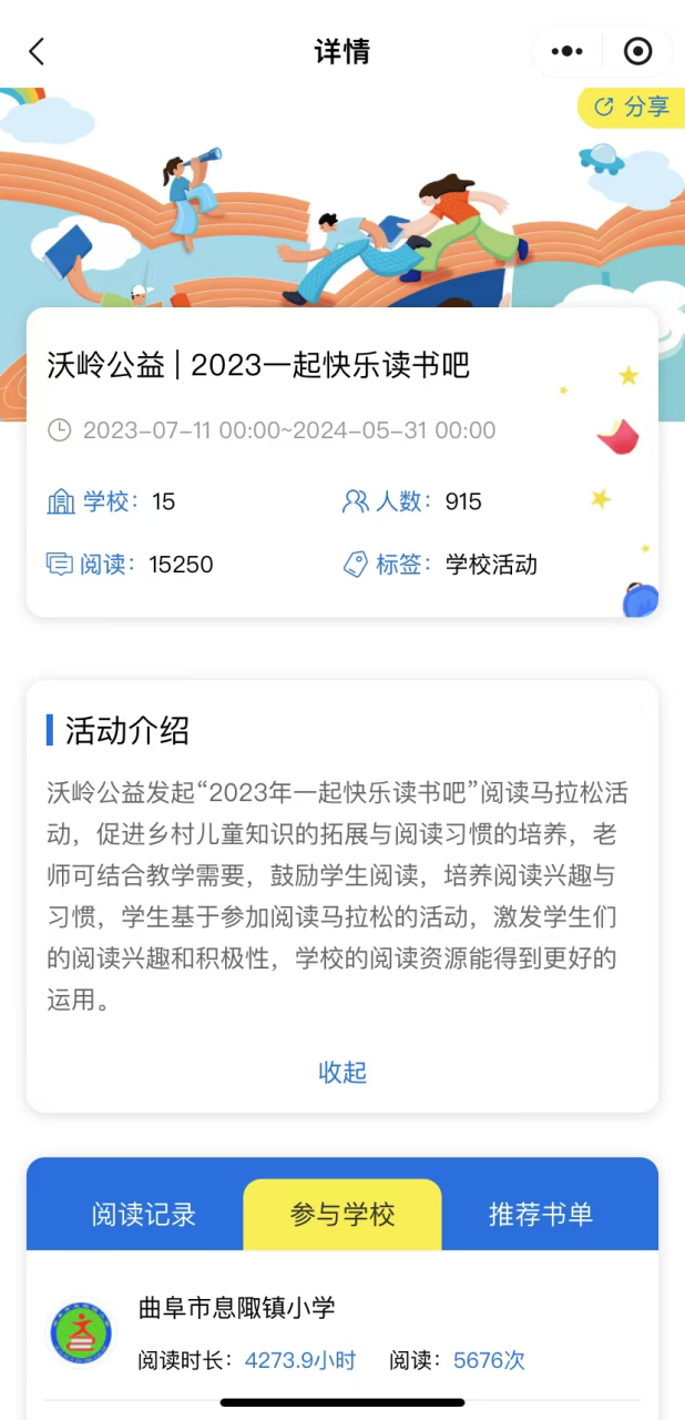 行业伙伴联合发起阅读马拉松活动并动员项目学校、公益馆等积极参与,记录阅读、培养习惯,阅读马拉松工作组根据激励标准为参与者提供阅读证书、图书奖品等支持。