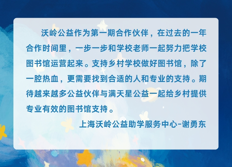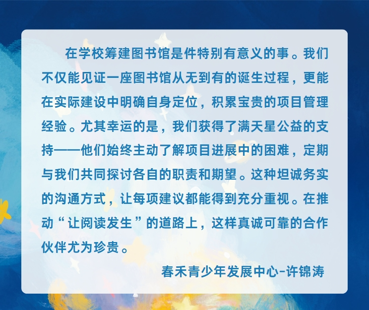 合作计划设计的初衷,是期待在满天星公益十数年积累的乡村小学图书馆管理方法经验上,结合您在当地的影响力与行动力,再加上学校对图书馆开放价值的认可,三方坚定协作,助力孩子们通过优质读物,认识一个丰富多彩的世界。