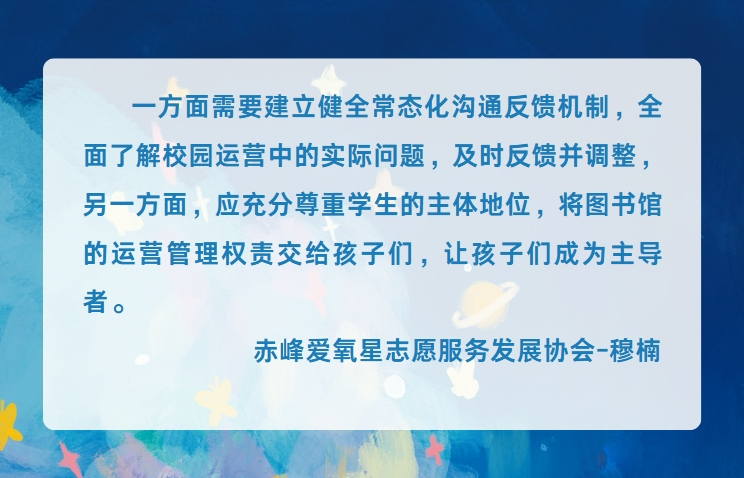 ■ 负责项目执行的全流程,对项目实施进行监督及指导,挖掘学校为学生持续提供更多阅读时间与机会的可能性;对项目未来能够持续运营抱有较高信心。