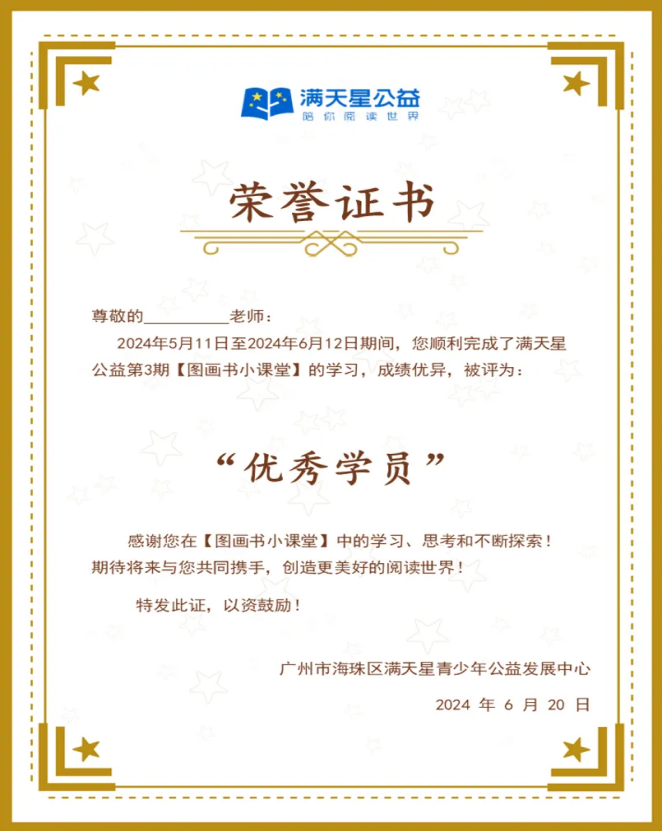 全勤参与并完成所有打卡作业的乡村学校老师将获得:由满天星公益颁发的优秀学员证书以及精心准备的一本书籍。
