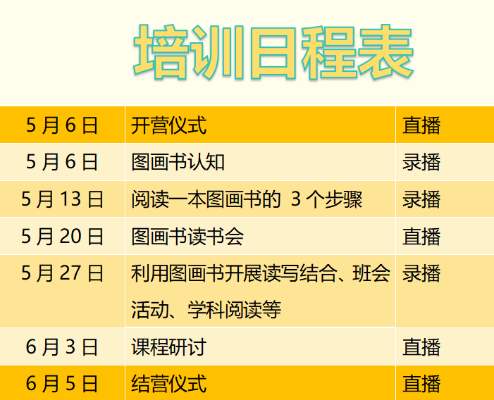 01 图画书认知 了解什么是图画书 明白图画书的了不起之处 02 图画书阅读 学习阅读图画书的三个步骤 开展图画书读书会 03 利用图画书开展教学活动 利用图画书开展读写结合、班会活动、学科阅读等 展开课程研讨,相互学习,分享经验 培训日程表