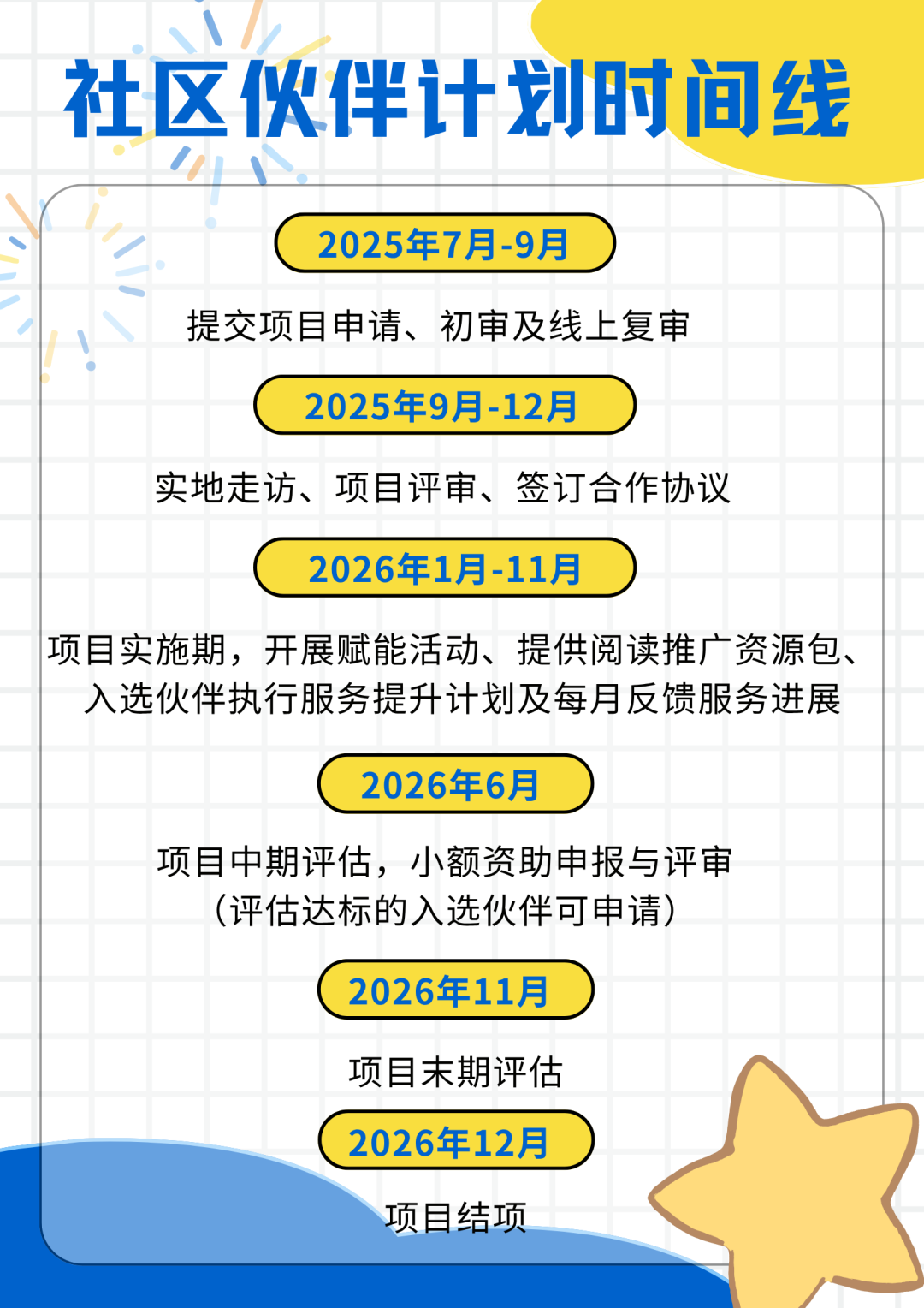 特别优质的入选伙伴,如符合满天星公益品牌项目合作条件,可提供满天星公益品牌项目合作机会,如社区图书馆、星囊计划、童书乐捐等,品牌项目合作不属于社区伙伴计划实施内容,如符合条件且有意向将另行沟通。