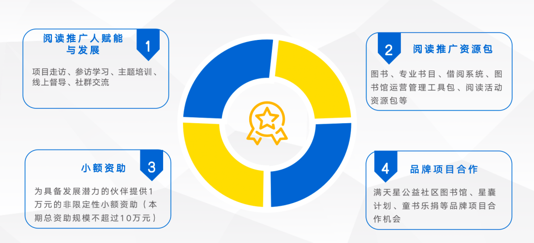 为入选伙伴提供阅读推广资源包,如300-500册优质新书、专业书目、借阅系统、图书馆运营管理工具包(馆长手册、志愿者管理手册等)、阅读活动资源包(方案、物料、操作指引等),或联合举办阅读活动。
