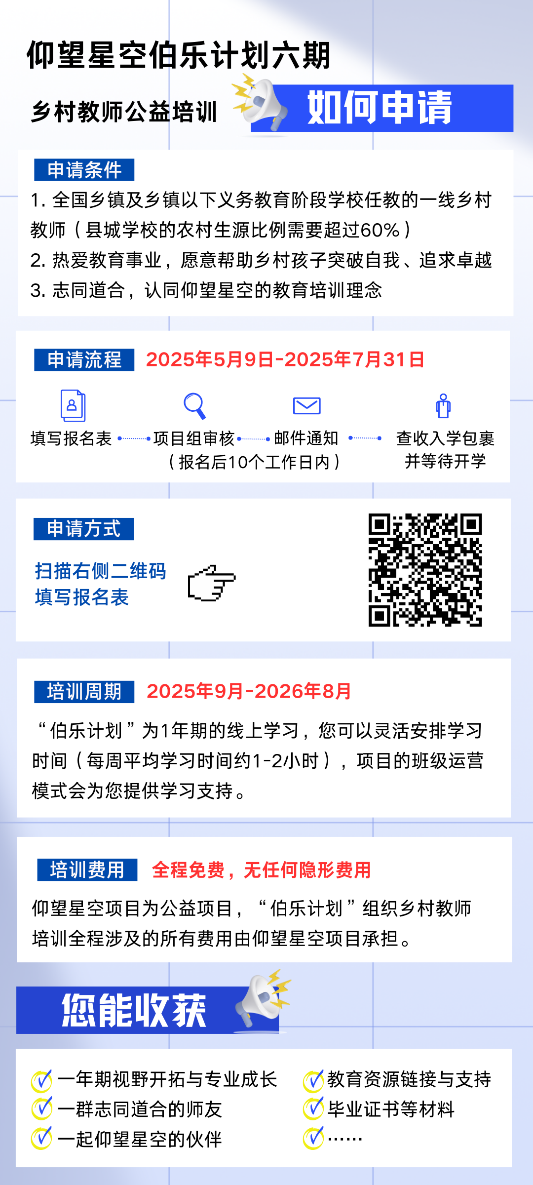 培训期间提供各类教育资源共享、技术支持等;培训结束后,乡村教师将成为仰望星空“伯乐计划”的校友,享受终身的校友支持和资源分享。
