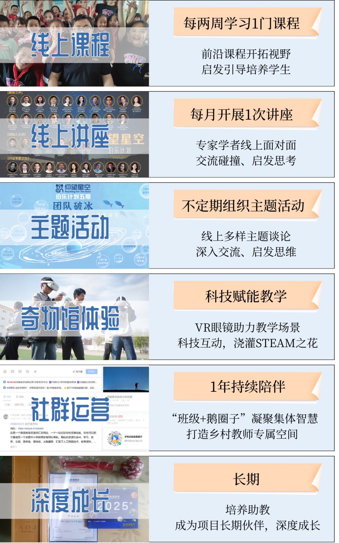 仰望星空“伯乐计划”乡村教师公益培训体系由六大模块组成。点击下方图片查看详情⬇️⬇️⬇️