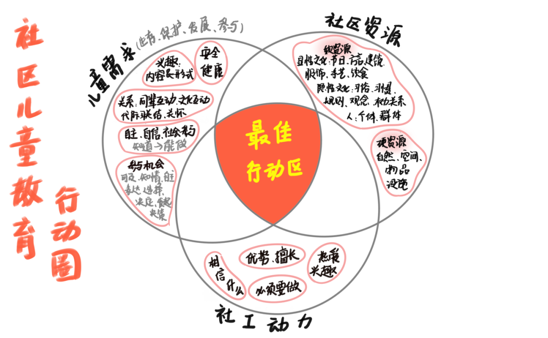 三年陪伴,我们发现最有效的教育行动,诞生于“儿童需求、社区资源与你自身动力和优势”三者的交汇处。我们称之为“最佳行动区”。