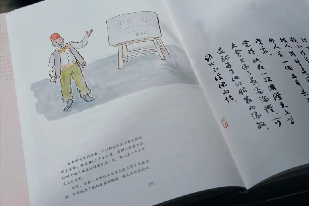 “在我看来,有些关节点,尤其是一些特别让人感动的段落,没有插图是一种遗憾。比如说,天刚蒙蒙亮,‘我’突然被一个奇怪的声音轻轻喊醒,这是小王子和‘我’初遇的场景,这儿有个插图多好。后面的文字中,‘我’把抽噎的小王子搂在怀里安慰他的段落,以及小王子睡着后,‘我’像捧着一件易碎的宝贝那样,抱起他重新上路的段落,都是很打动人、不妨加上插图的关节点。我不揣浅陋就此作了尝试,不仅略加改动地临摹了几幅原作的插图,以示向作者致敬,而且自己画了一些插图——算是创作吧。”