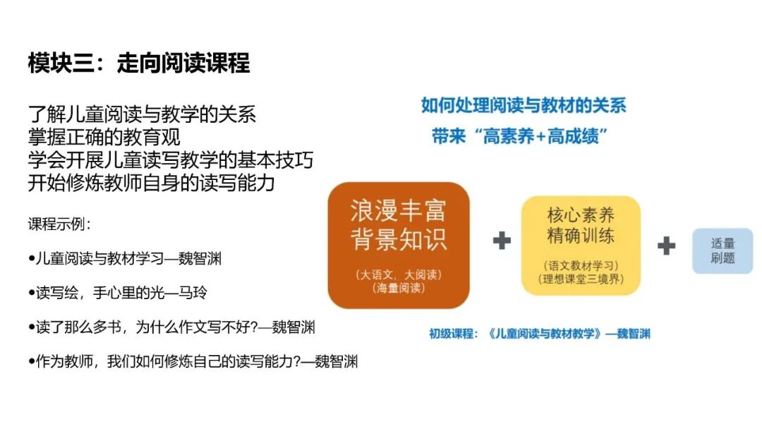 初级课程是非常好的,哪怕是中学物理化学的老师,他们也是孩子的父母,也愿意主动报名学习。课程本身有魅力就是强大的生命力。在区域应该成为一种老师的成长模式,大面积地推荐课程,让老师了解阅读的底层逻辑,这个课程都是体系化的容易入门的,如何进一步深耕、聚焦,需要我们进一步探索。这也就是为什么我们一直在大力地促成初级课程的试点学校,和担当者进一步深入合作。