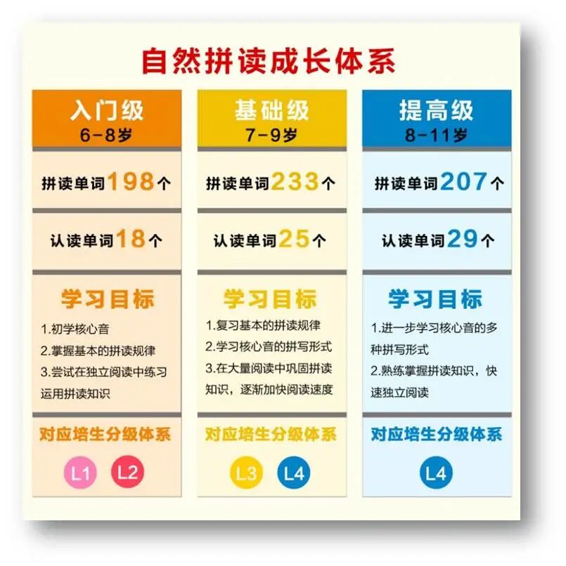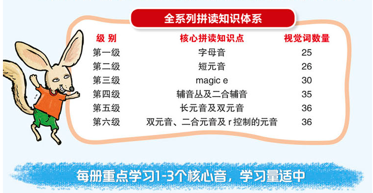 这套书包含3个级别,入门级、基础级、提高级,共56册绘本。按照英国教育部颁布的《Letters and Sounds—自然拼读高效教学原则与实践》而编写,按字母在单词中出现频率的高低为顺序进行学习,孩子可以边学拼读知识点,边尝试独立阅读。读完这套书,孩子可以掌握完成40+个核心音。