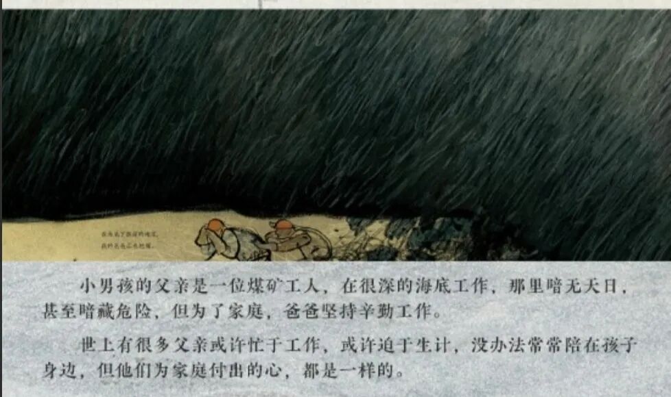 小男孩的爸爸是一位深海的煤矿工人。每天,当男孩醒来,他会望向窗外的那片海,那里有他的爸爸,在深深的海底挖煤。之后,无论小男孩是和朋友一起兴奋地荡秋千,还是去集市上买东西,又或者在吃午餐,他总是想起深深的海底有他的爸爸在辛勤地工作。