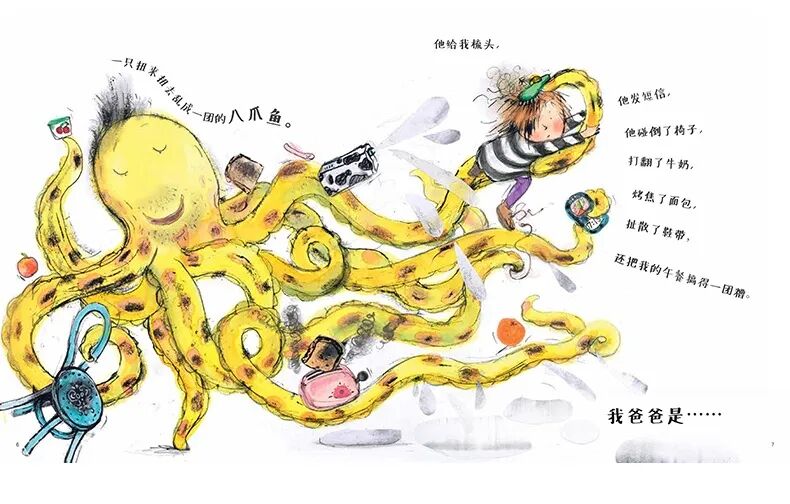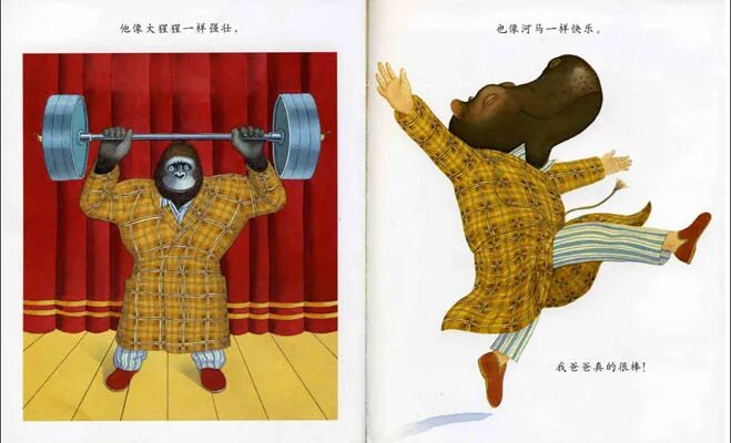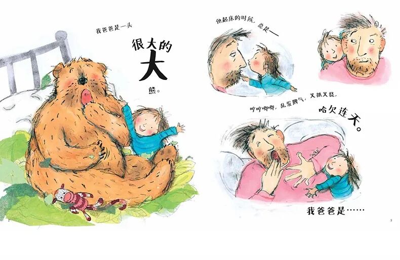 我爸爸是一头很大的大熊,起床哈气连气;我爸爸是一条淘气的鳄鱼,一笑就露出满嘴大牙;我爸爸是一只傻呵呵的猴子,一路唠里唠叨;我爸爸还是一只饿极了的大老虎,把所有东西搅搅拌拌就下肚。不管他是什么,都是我最可爱的爸爸。