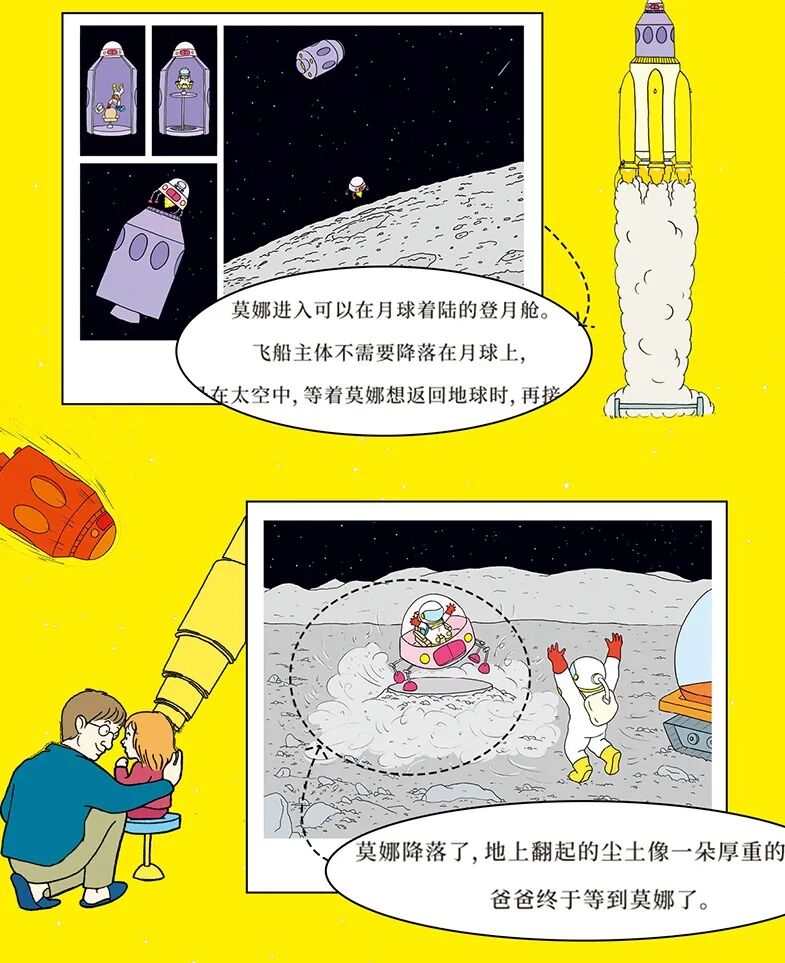飞行结束,莫娜的登月舱稳稳当当地降落到了月球上。爸爸终于接到莫娜了,他们一起在月球上度过了愉快而特别的一天……