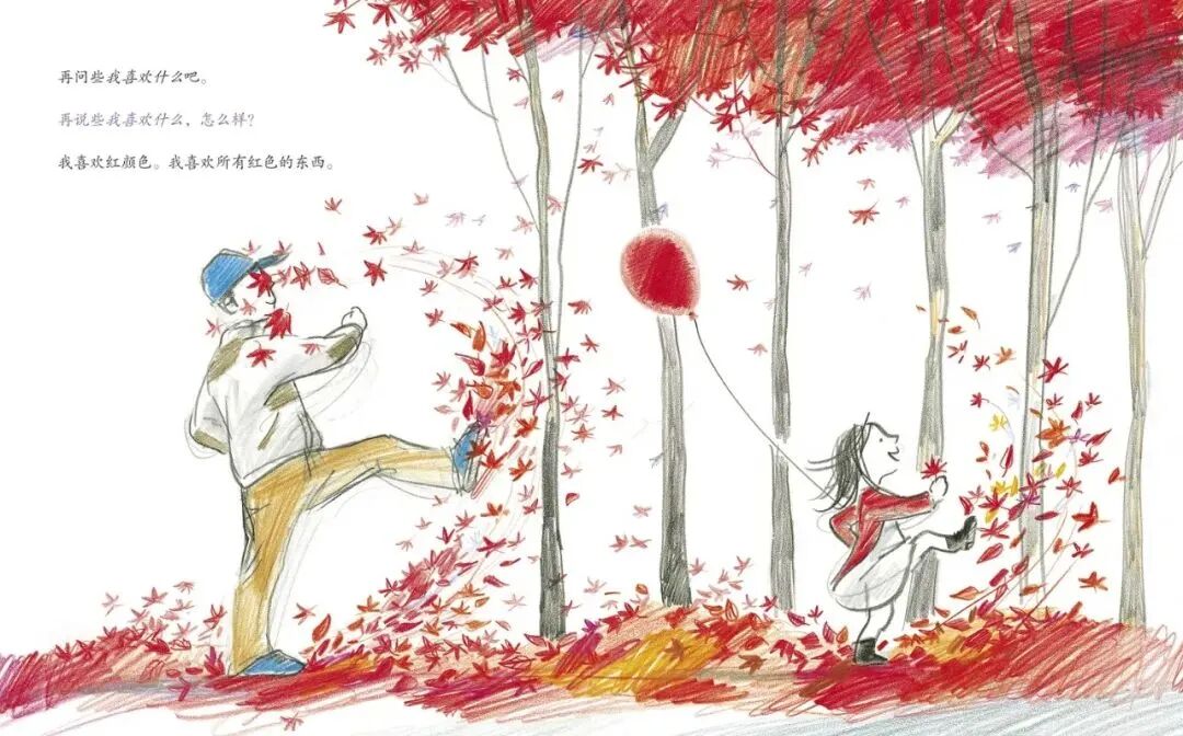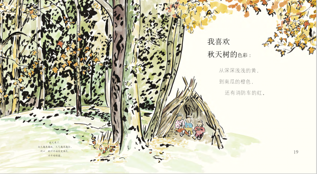 “我喜欢秋天树的色彩:从深深浅浅的黄,到南瓜的橙色,还有消防车的红……”