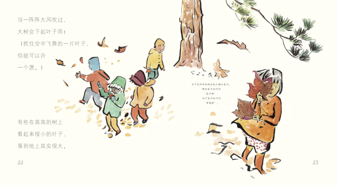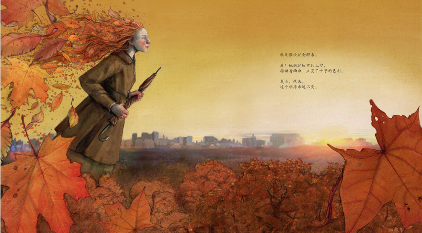 哈迪·恩杰用丰富的想象力将四季人格化,赋予每个季节独特的个性——春天充满朝气,夏天向往自由,秋天成熟稳重,冬天渴望温暖;莉萨·埃伊萨托的插画让四季的形象更有血有肉起来——春天是小男孩,夏天是少女,秋天是成年女子,冬天是老妇人。