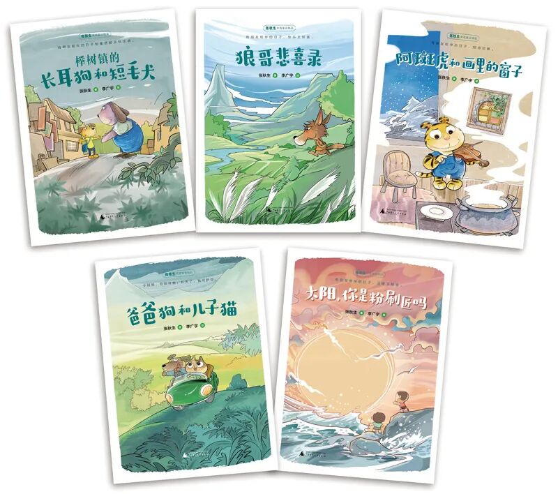 这套书收录张秋生先生生前新创作的童话童诗,分别是《榉树镇的长耳狗和短毛犬》《狼哥悲喜录》《阿斑虎和画里的窗子》《太阳,你是粉刷匠吗》《爸爸狗和儿子猫》5册。在他的笔下,一个童话小镇不仅桃红柳绿、美点飘香,还熙来攘往,盛开着许多关于友情的有趣的故事。小镇上的动物居民,以他们的善良、智慧相互帮助,将寻常生活过得有滋有味。