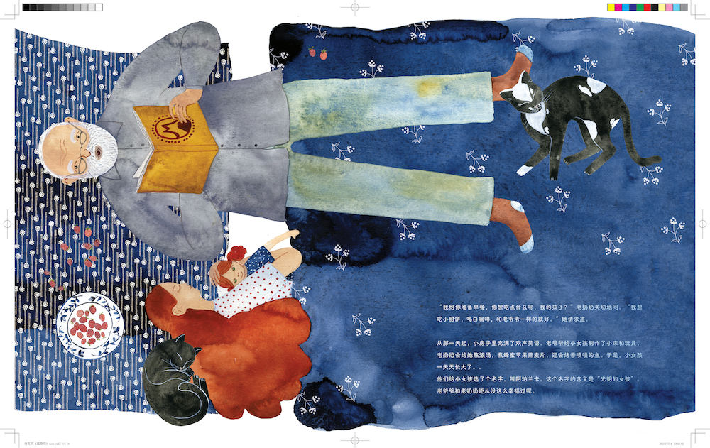 《小女孩的蓝染布坊》 :这个迷人的、童话风格的故事讲述了一个叫阿珀兰卡的小女孩和她祖父的蓝染花布坊,这里充满了古怪而奇妙的物品、香味和魔法。随着阿珀兰卡学习蓝染技艺,年轻的小读者们也跟着她一起学习。绘者精美的水彩插图,如蓝白染布和印花,与书的主题形成了完美和谐。