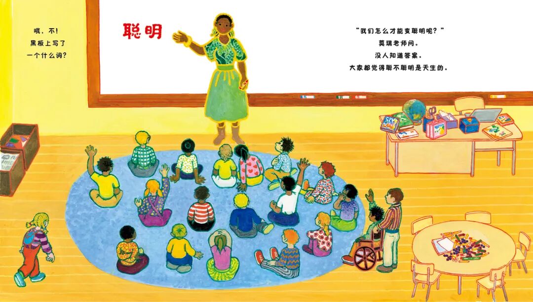 幸运的是,菲菲有莫莉老师。这位智慧敏锐的老师满心温柔,她不仅循循善诱地带班里的孩子讨论“聪明”这个复杂的概念,还在他们遇到困难时给予坚定有耐心的鼓励。