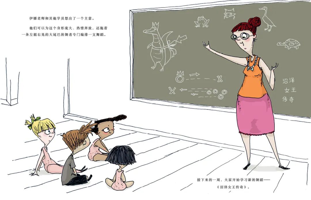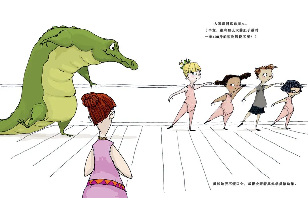 她和班里的其它孩子们不但接纳了这条可爱的短吻鳄,而且一同想办法,为帮他实现跳芭蕾的梦想排除了各种各样的困难。