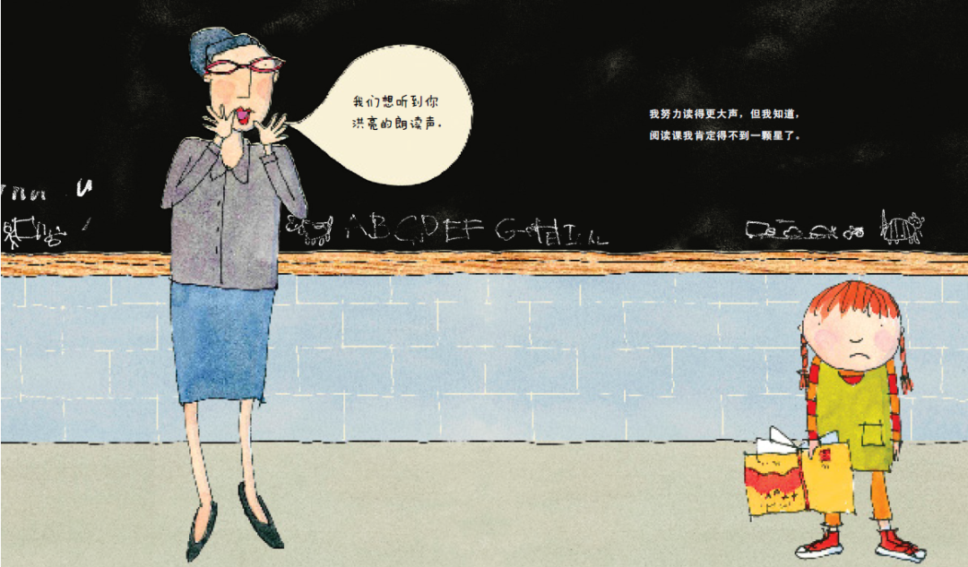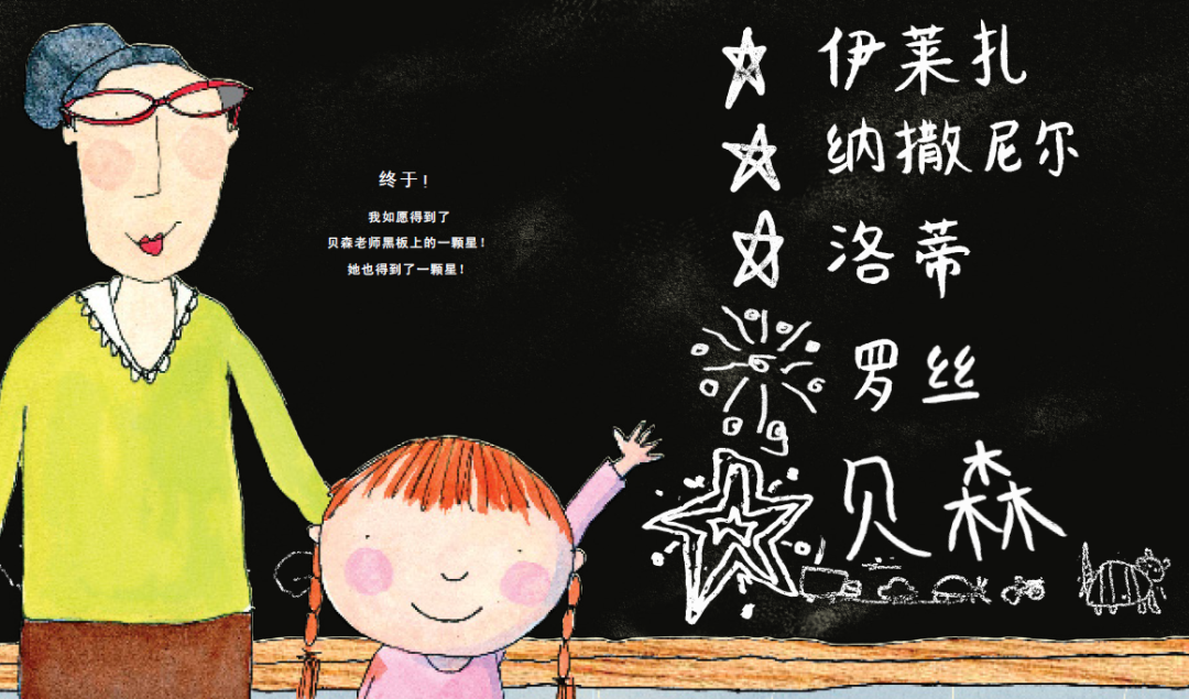 和许多小学幼儿园一样,贝森老师会因为孩子的好表现,奖励一颗星。而故事里我们的小主人公,最大的沮丧就来自于——“爱做白日梦,爱乱涂乱画的我,永远也得不到贝森老师黑板上的那颗星。”