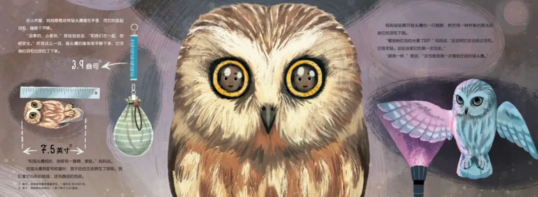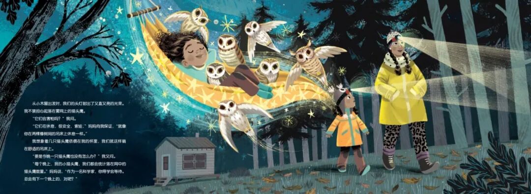 这本书以儿童为中心,对科学家的工作进行了迷人的介绍,在插画家细腻而充满质感的画面中,母女二人在森林保护区探索猫头鹰的踪迹,头灯发出的光线在漆黑的夜晚显得格外美丽……