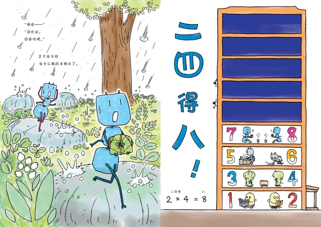 吉田战车老师把宫本哲也老师想出的“2段纵型九九表”,以虫子们各自生活的“虫公寓”来表示。结合充满幽默感的“虫虫”们,念着“二二得四”的口诀,即使是学龄前儿童也能自然而然地理解“九九乘法口诀”的概念。
