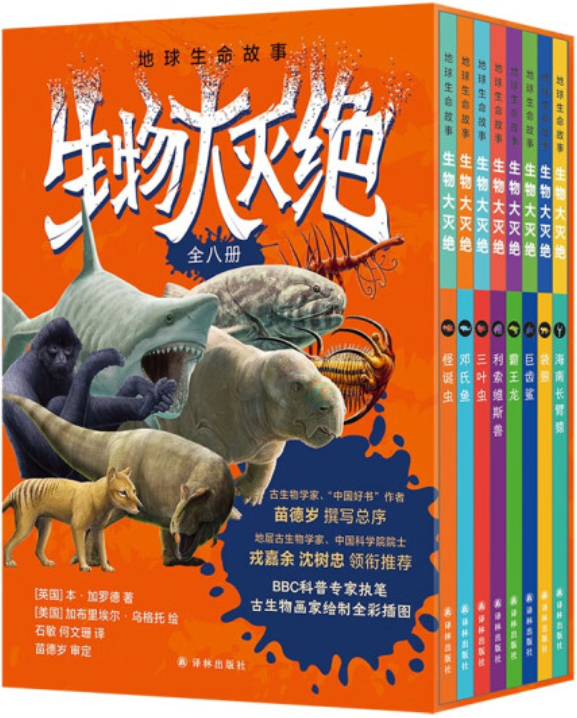 “地球生命故事·生物大灭绝”系列是由英国著名的演化生物科学家、BBC科普主持人本·加罗德博士和美国知名古生物画家加布里埃尔·乌格托联手打造的青少年地球生命科普丛书。该系列共八册,从生物演化的角度讲述了4.5亿年间,地球典型的五次大灭绝,一次新近发现的大灭绝、人类世大灭绝,以及濒危物种保护。同时,还介绍了怪诞虫、三叶虫、邓氏鱼、利索维斯兽、霸王龙、巨齿鲨、袋狼等七种具有代表性的灭绝生物,以及中国特有的极度濒危生物海南长臂猿。