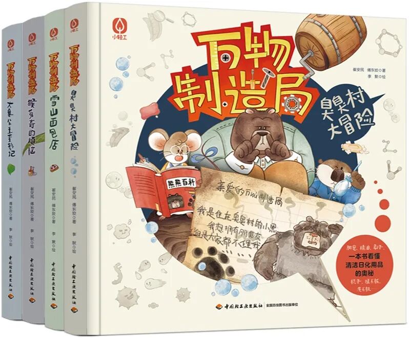 《万物制造局》全书一共四册,分别是讲述清洁日化用品的《万物制造局——臭臭村大冒险》;关于食品类的《万物制造局——雪山面包店》;关于文具用品类的《万物制造局——猴芬奇的烦恼》;以及讲述纺织品类的《万物制造局——大象公主变形记》。每一本故事都是通过接受委托——解决问题——深入观察——层层闯关——圆满结局的路径来进行科普揭秘,细节满满,在制造中学习科学原理、培养创新思维。