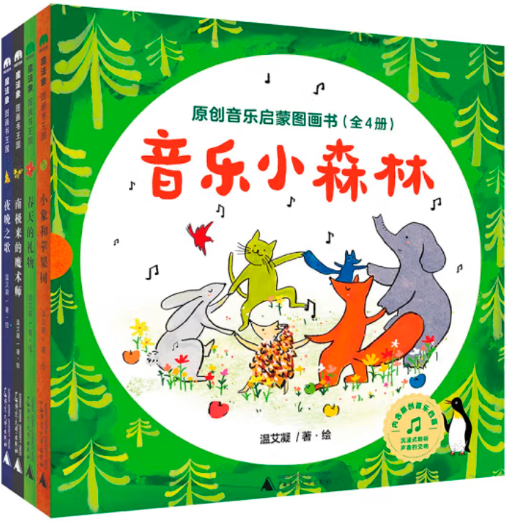 但是,语言是非常抽象的符号系统,要想辅助语言学习,我们就需要借助多模态的绘本。这次,我给大家推荐“音乐小森林”系列绘本:《小象和苹果树》《春天的礼物》《夜晚之歌》《南极来的魔术师》,它把音乐、图画、语言三种模态完美地融合到了一起。