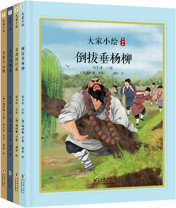 《古典名著<水浒传>绘本》(全4册)包括《大家小绘·风雪山神庙》《大家小绘·倒拔垂杨柳》《大家小绘·景阳冈打虎》《大家小绘·智取生辰纲》四个故事,是编者杨子卿与绘者周苗在原著基础上,以孩童视角共同创造的新国风故事绘本。这个系列有以下几个特点:1、文本尊重原著、故事精炼,保留了经典名著的精髓与文韵,又轻松易读、引人入胜;2、绘者周苗紧扣二创文本,以独特的绘画技艺,创作了一个个惟妙惟肖、跃然纸上的人物,灵动切题的故事场景,颇有意趣;3、每个故事独立成册,开卷有“前传导读”部分,简介《水浒传》和分册人物主角,引发孩子的阅读兴趣;4、每册故事结束后,编者精心设计了知识拓展、思维导图等板块,或是《水浒传》人物小传、单篇故事拆解,或是与故事相关的人文科普等,激发孩子对中国经典文学的阅读兴趣;5、这个系列为孩子们准备了“大家小绘有声故事卡”,让孩子们在阅读原创绘本的同时,还可以通过卡片上的二维码在线收听“水浒”系列故事。简言之,这是一套打开孩子的文史视野,提升孩子的阅读与写作能力以及艺术审美的经典绘本。