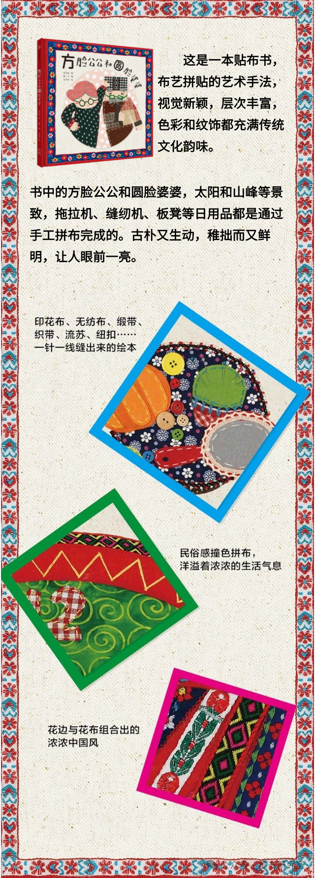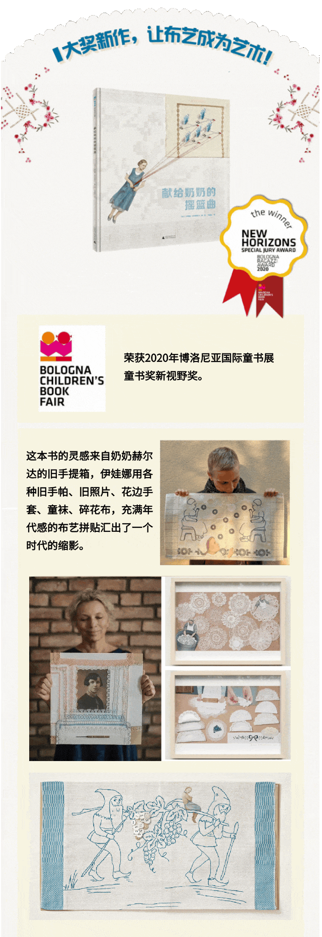 传统技艺在图画书中焕发新光彩。布艺贴画、拼布、刺绣等艺术形式再次走入人们的视野,受到越来越多人的喜爱。阅读越精彩精选国内外优秀布艺刺绣图画书,让大人和孩子阅读到“布一样”艺术,感受图画书的无限可能的魅力。