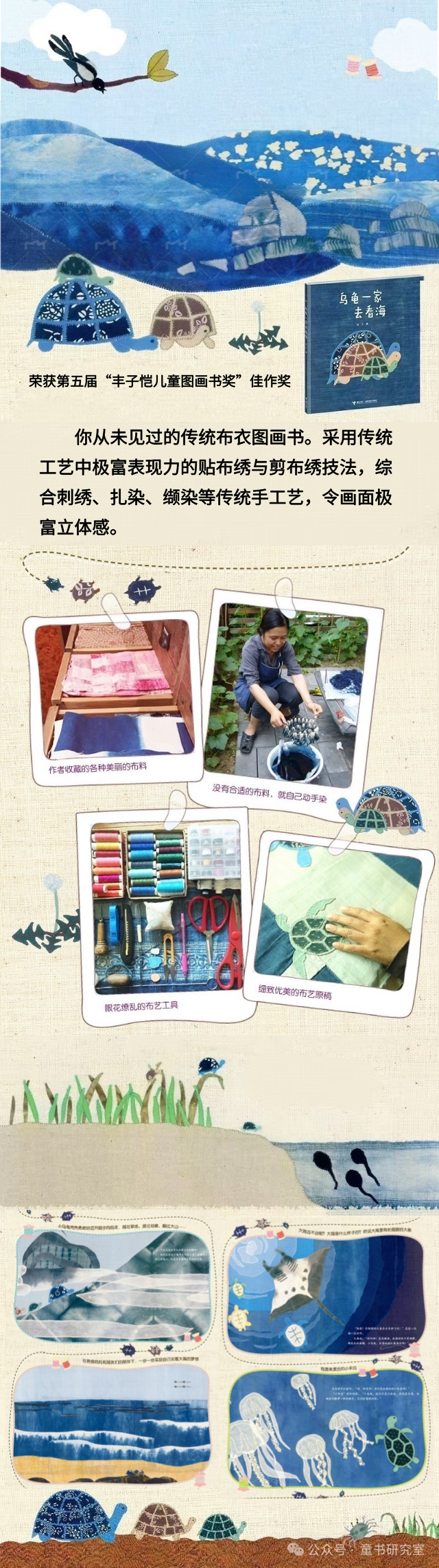 最具代表的应该算是张宁的《乌龟一家去看海》,原稿全用布料与针线缝制而成,如云雾用的是白纱、水母用的是蕾丝,技法上使用了传统布艺中的贴布绣与剪布绣,还运用了扎染、蜡染、夹染等多种染布技法。