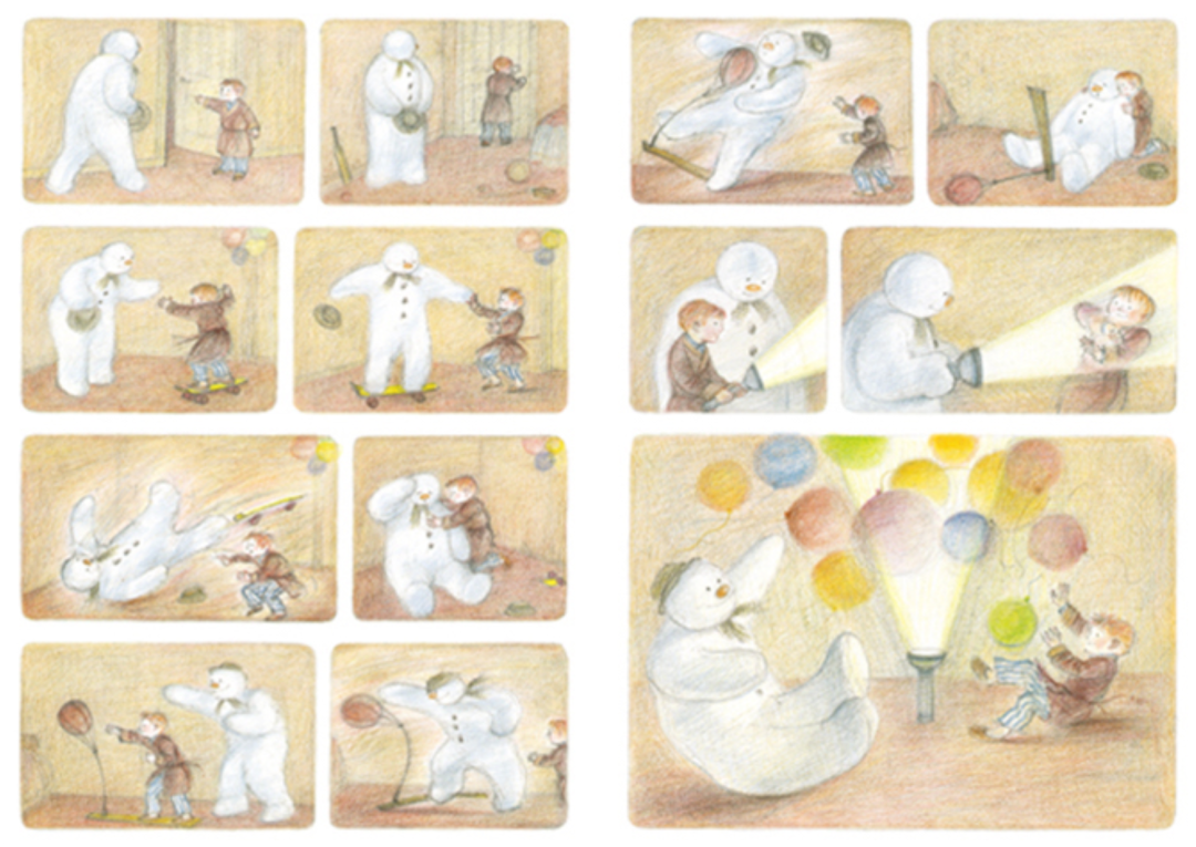 他们一起看电视、玩耍、吃饭,雪人还和男孩一起飞到风雪交加的天空上……可是当第二天早上醒来时,少年冲到屋外却发现雪人已经融化了。