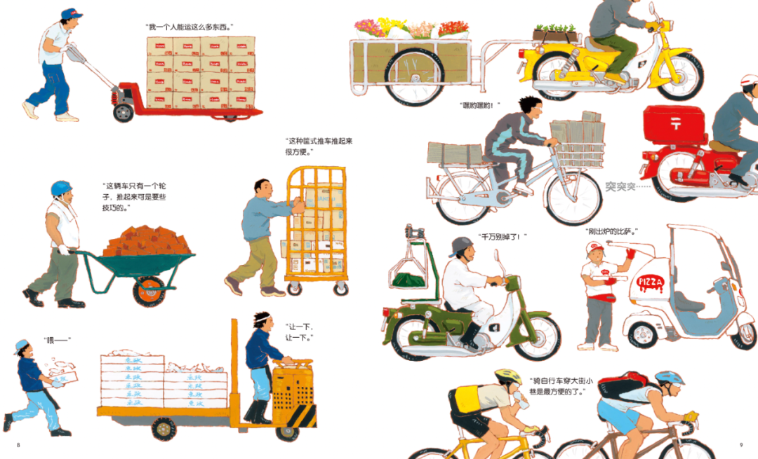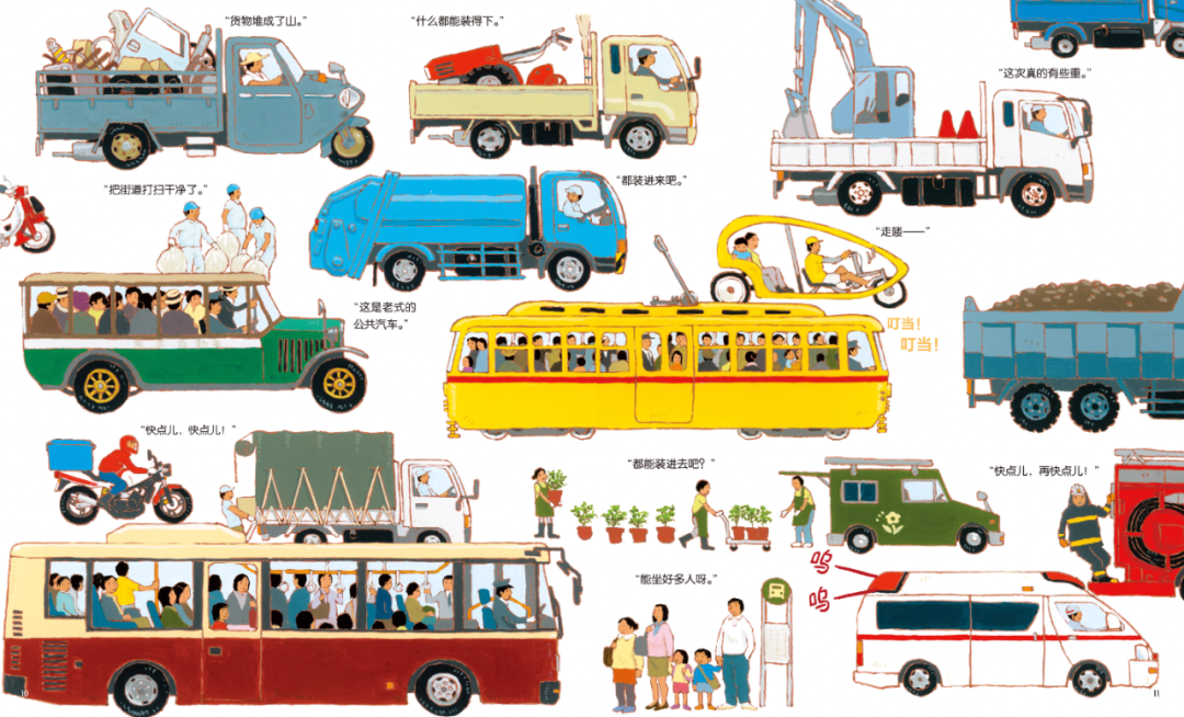 绘本用简洁的话语讲述运输的历史发展过程,从祖先用手捧着运东西到学会使用袋子、扁担,再到各种各样的车出现:牛车、人力车、三轮车。