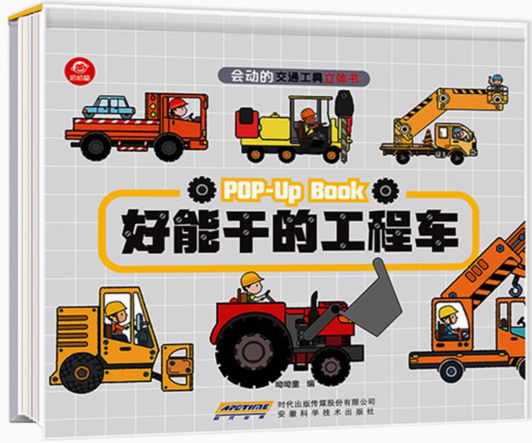 7种有趣的工程车:压路机、吊车、高空作业车、拖车、拖拉机……等,让小朋友在翻翻、转转、抽拉等机关的玩耍下,满足探索欲。
