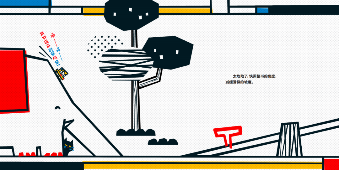 小汽车飞上天了,请你旋转书本,让它落到树冠里,以免受伤 ;