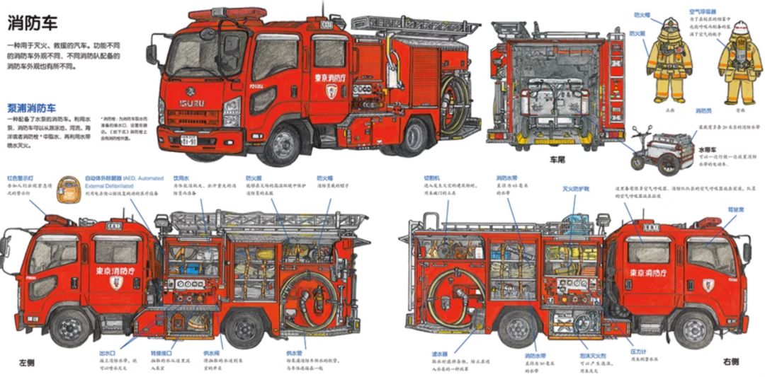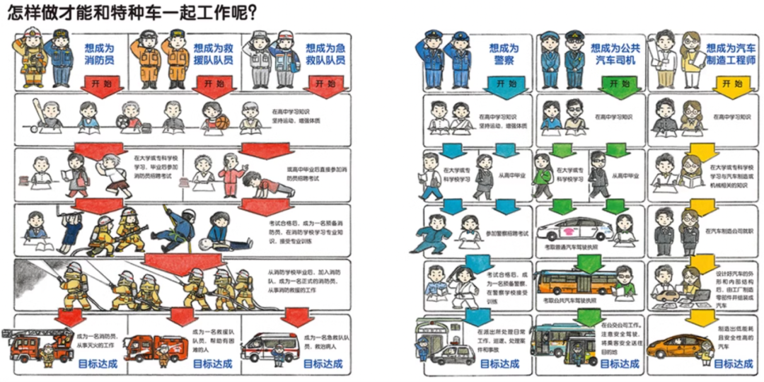 不仅如此,绘本中还将与特种车共同工作的职业进行了介绍,比如: