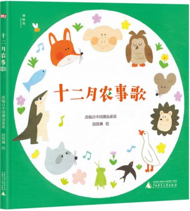 潮汕童谣是潮汕文化的重要组成部分,具有深厚的历史底蕴和独特的地域特色,是潮汕农耕文化的体现。《十二月农事歌》将口口相传的童谣以绘本形式呈现,为潮汕文化的传承提供了一个很好的传播载体。绘本包含十二个月的农事描述,反映了不同季节的农耕活动和农作物的生长规律,这对于生活在现代城市的孩童来说,是一种难得的了解传统农耕生活的途径,有助于培养他们对农业的认知和尊重,感受时间的流逝、季节的变化。绘本的插画根据每个月的农事特点,呈现出相应的节气场景、动植物形象,每一页色彩鲜艳、小动物形象可爱生动,增强了文本的感染力和趣味性,帮助孩童更好地理解童谣的内容之外,也能提升其艺术审美。