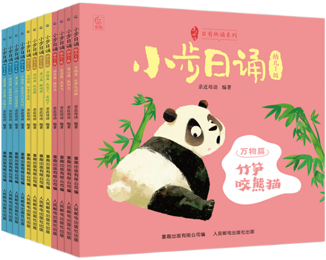 《小步日诵》根据幼儿不同阶段的身心发展水平,进行科学的分级。整套书分为3个级别,分别是幼儿1级(3~4岁适读)、幼儿2级(4~5岁适读)、幼儿3级(5~6岁适读)。每一级的字数和难度缓坡而上,逐级提升,无论你家的孩子处在什么样的水平,都能找到适合的诵读篇目。每个级别包含4册,按照6大主题组织选篇。其中“万物篇”“游戏篇”“童心篇”“生活篇”和孩子的生活和成长息息相关,“古诗篇”“蒙学篇”根植于中国传统文化,帮助孩子从小打下中国文化的根基。