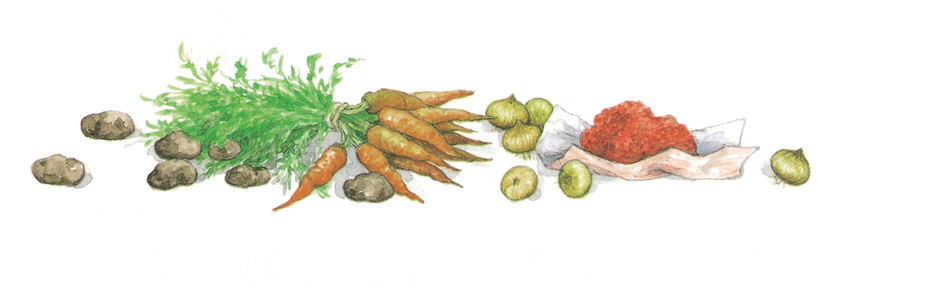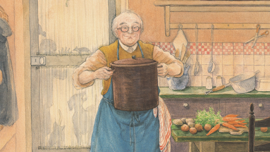 老爷爷去市场,买回来肉馅、小土豆、小洋葱和细细的胡萝卜,煮了一锅汤。