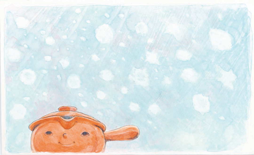 白釉砂锅罩上了一层雪,变白了,很快就变得和雪一样凉了。