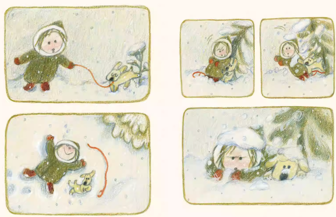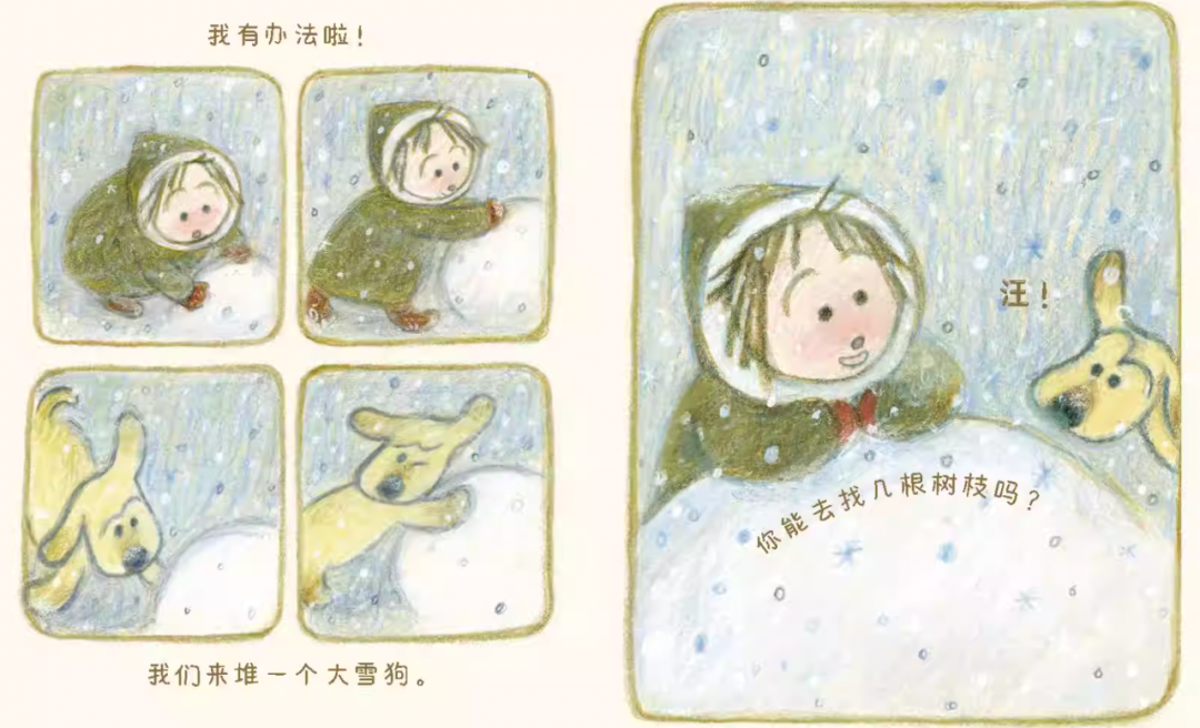 翻开绘本,映入眼帘的是治愈的下雪天、活泼的小狗、可爱的小主人公。
