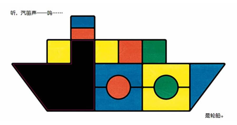 这本书通过红、黄、蓝、绿四种鲜艳的颜色和正方形、长方形、三角形、圆形等基本形状的积木,巧妙地组合变化成汽车、公交车、火车、轮船、飞机和火箭等不同的交通工具。