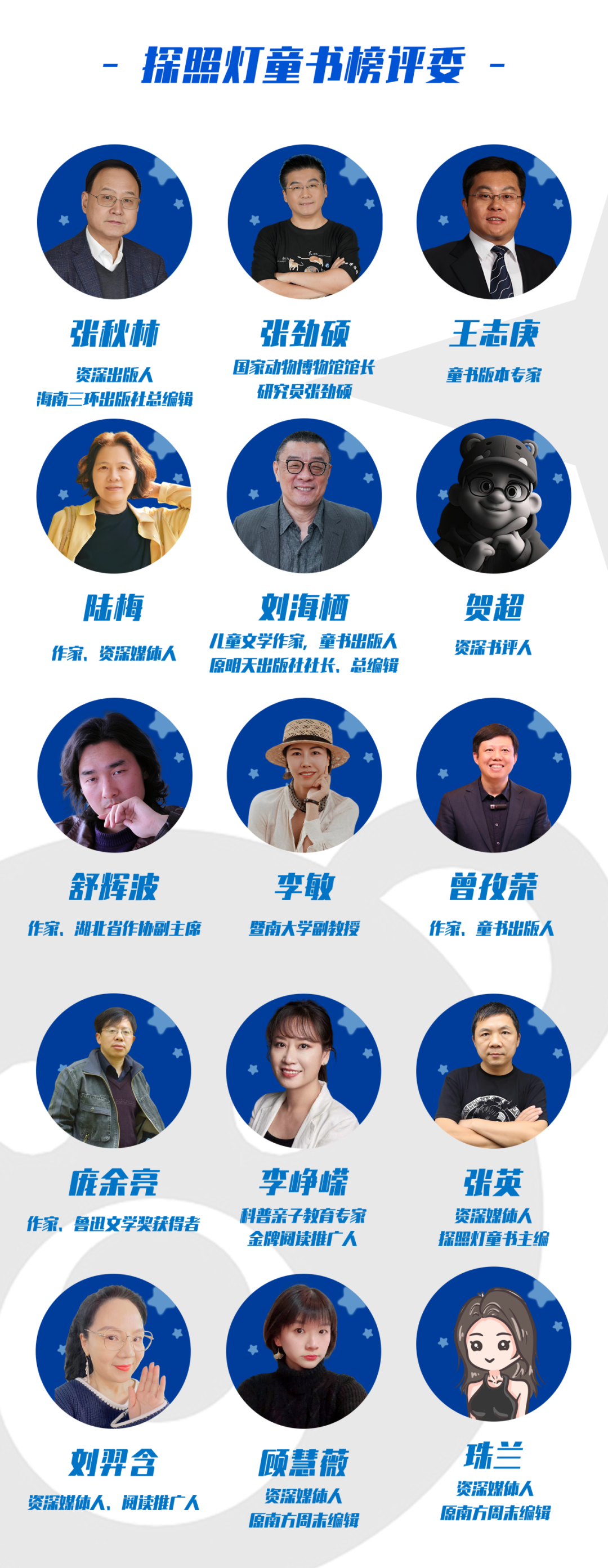 根据十五位评委投票,探照灯童书榜每月评出10本优秀的原创童书和绘本、翻译童书和绘本以及自然和博物书单;提名书单、月度榜单将在探照灯童书榜、探照灯好书、腾讯读书等新媒体渠道发表。