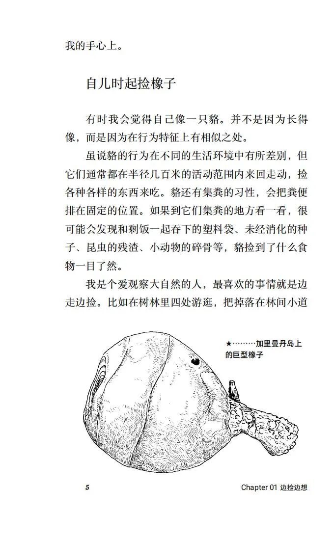 " 这本书是所有自然爱好者都可以读的一本。作者盛口满讲故事的方法信手拈来:从橡子的形态联想到生物学,再联想到跟食物有关的东西,再联想到跟生态学研究的关系……看似很跳跃,但又围绕着一个核心,最终还能回到讨论的话题的原点。这种讲故事的方法让人读起来很舒服,特别符合青少年在没有任何知识储备的时候去跟随着探索自然。"