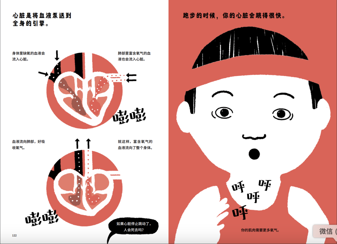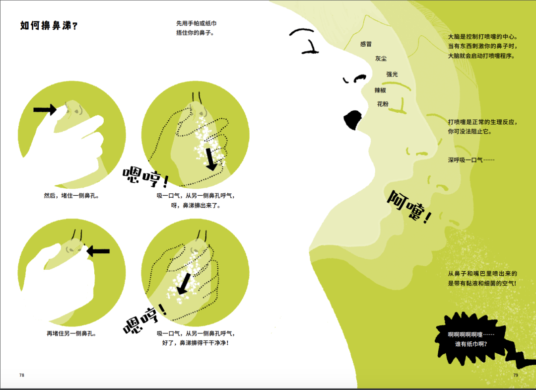 " 这本书里有不同的液体,有些是大人甚至羞于谈起的鼻涕、尿液,当然还有眼泪、血液。这是我们很熟悉的东西。这些体液就在我们的身体里面。让孩子去触及这些知识,会对周围的世界产生一个立体的认知。"