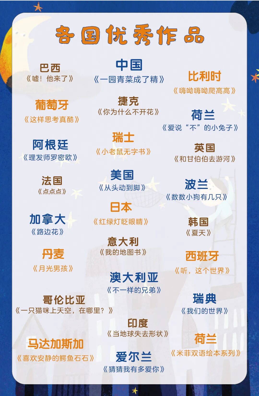 书目以国内外经典的文学类图画书和优秀的韵语类作品为主体,同时择选国内外高品质的人文百科作品,力图选出能够历经时间和空间考验的优秀作品。